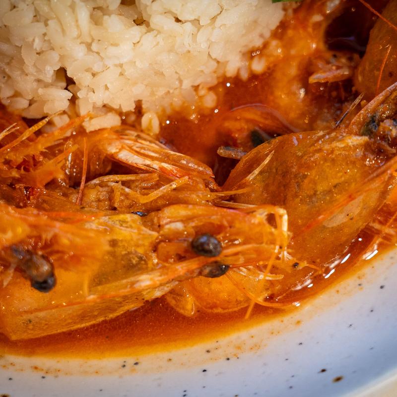 Shrimp, salsa huichol, garlic bread, white rice