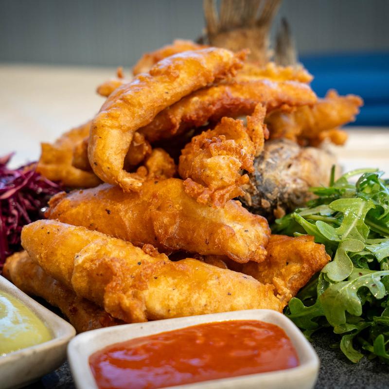 Whole tilapia, lime coleslaw, arugula salad, salsa roja, aguacate salsa
